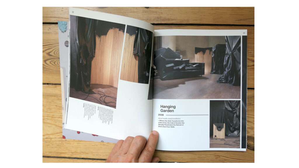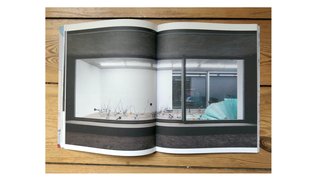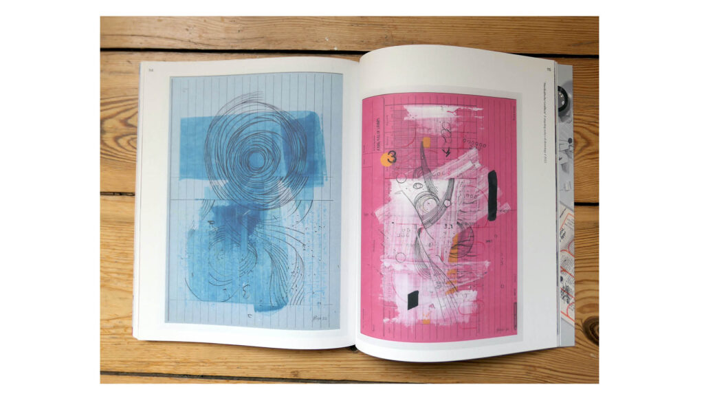 A complex assemblage, composed of documentation photos, texts and drawings, becomes an interlocking whole in its dynamic flows and fields and animates the paper as a vibrantly structured visual composition. A piece of music for the eyes, in which the boundaries between documentation, draft and work become blurred in a surreal mesh of the concrete and fictional. Here, the reader generates their own individual temporal axis based on their speed of observation and focus on the optical elements, thus becoming a mixing board for a composition realized as a catalogue.