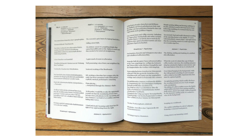 Three text pieces give a deeper insight into Roigk’s understanding of sound as material and the translation of sound events into other media.