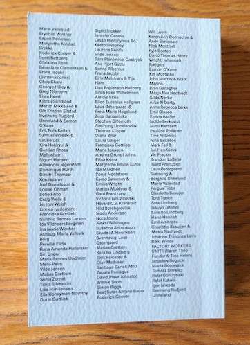 With Rosa Marie Frang, Ane Hjort Guttu, Brandon LaBelle, Ola Innsett, Stephan Dillemuth, Arne Skaug Olsen, Eamon O’Kane , Skade Henriksen, Susanna Antonsson , Marie Vallestad, Sara Bo Lindberg, Laus Østergaard, Mathijs van Geest, Gard Frantzsen and Matias Grøttum.